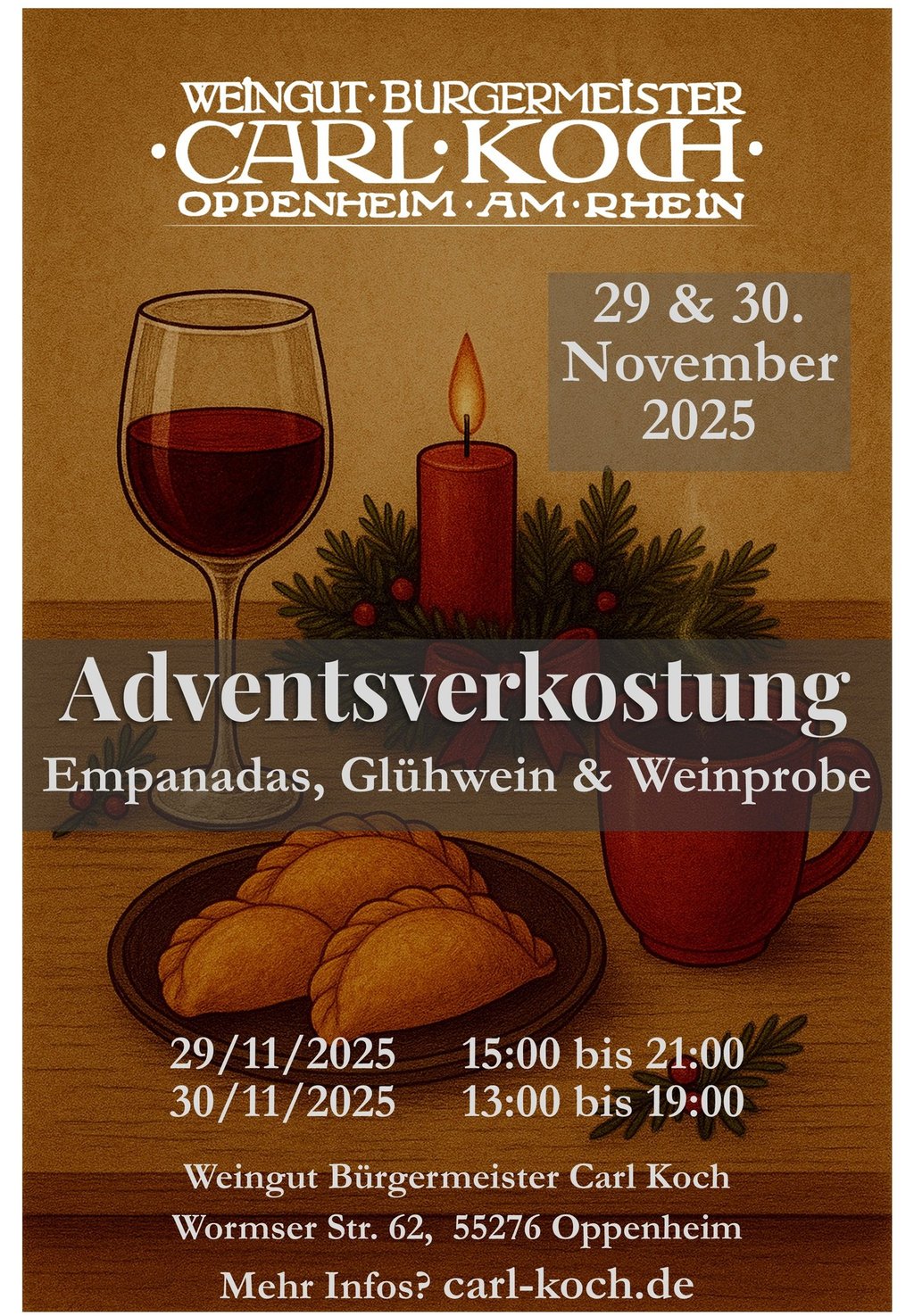 Wir öffnen unsere Vinothek für euch! Genießt ein Glas Glühwein, probiert unsere Weine und lasst euch von frisch gebackenen Empanadas verwöhnen. Entdeckt unsere Räumlichkeiten, kommt mit uns ins Gespräch und nutzt die Gelegenheit, am Veranstaltungstag von 10 % Rabatt auf alle Weineinkäufe zu profitieren. Feiert mit uns die Adventszeit in gemütlicher Atmosphäre! 29.11.2025 15:00 bis 21:00 30.11.2025 13:00 bis 19:00